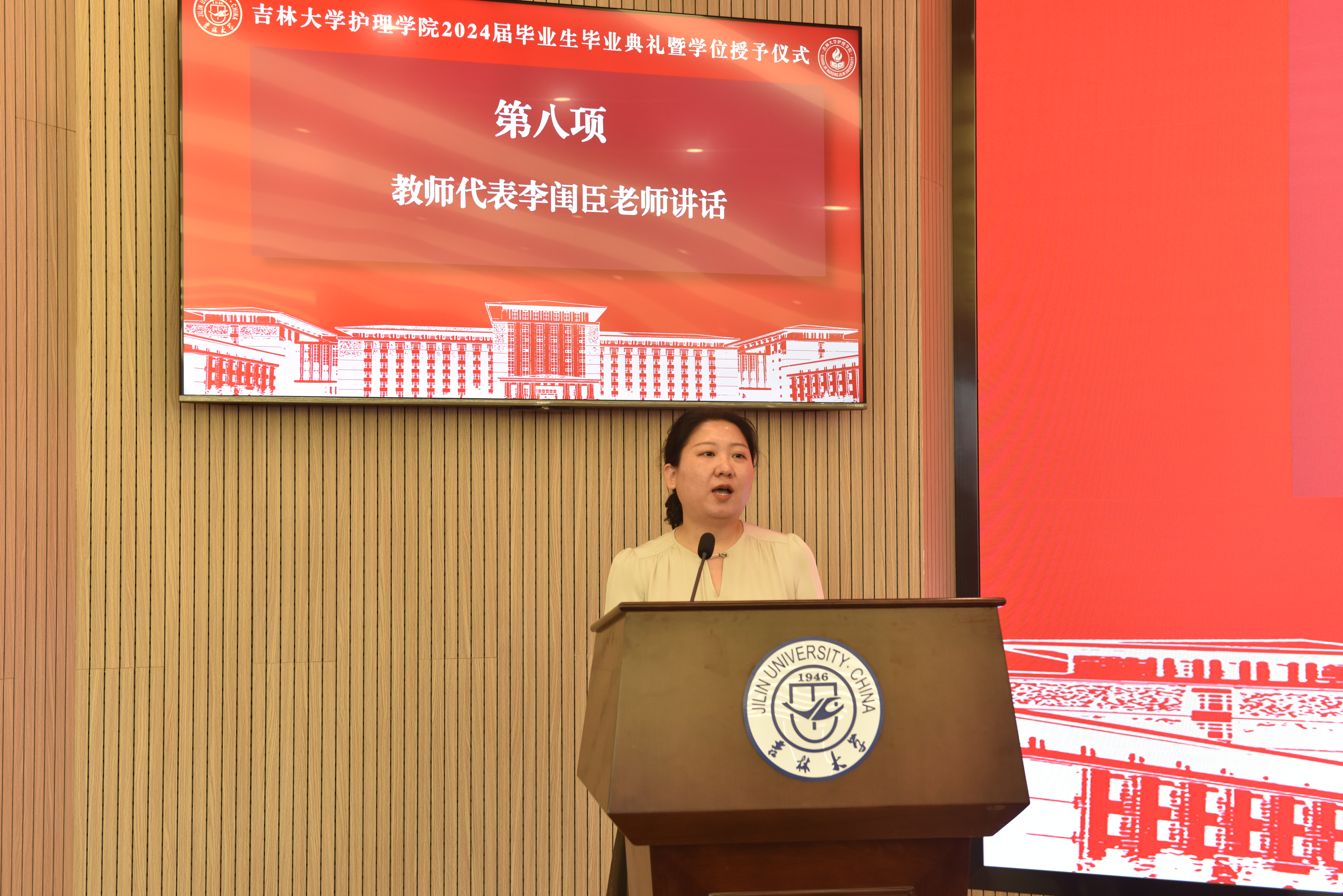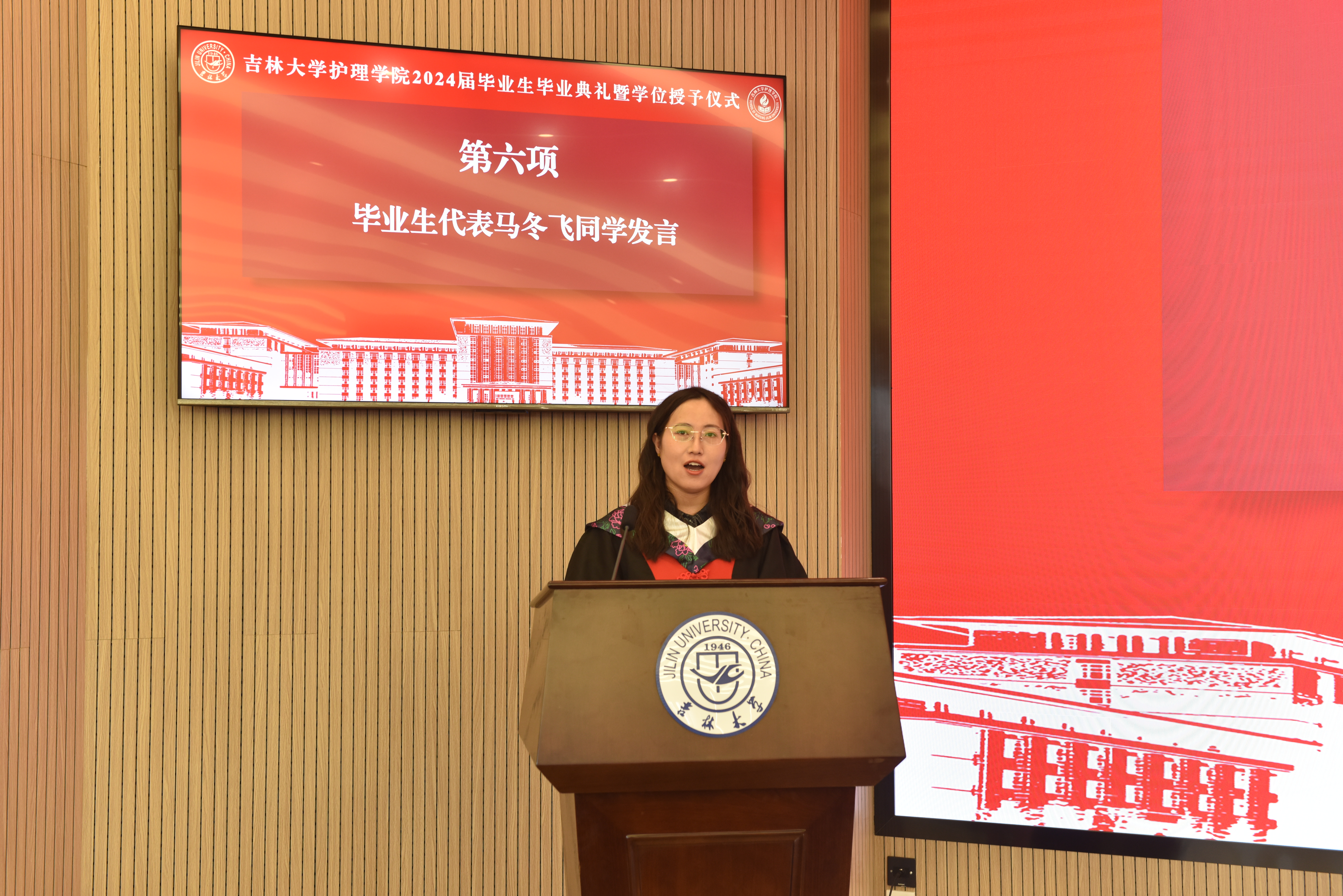 研究生毕业生代表马冬飞和本科毕业生代表张婷聿发言,深情回忆了学习生活的点点滴滴,深切表达了对学院、对老师的感恩之情和对同窗的不舍之意。教师代表李闺臣向全体毕业生送上了最诚挚的祝福,希望同学们永葆奋斗底色,勇敢地为自己的人格以及人生而奋斗,在拥抱未来的道路上追寻万丈光芒。