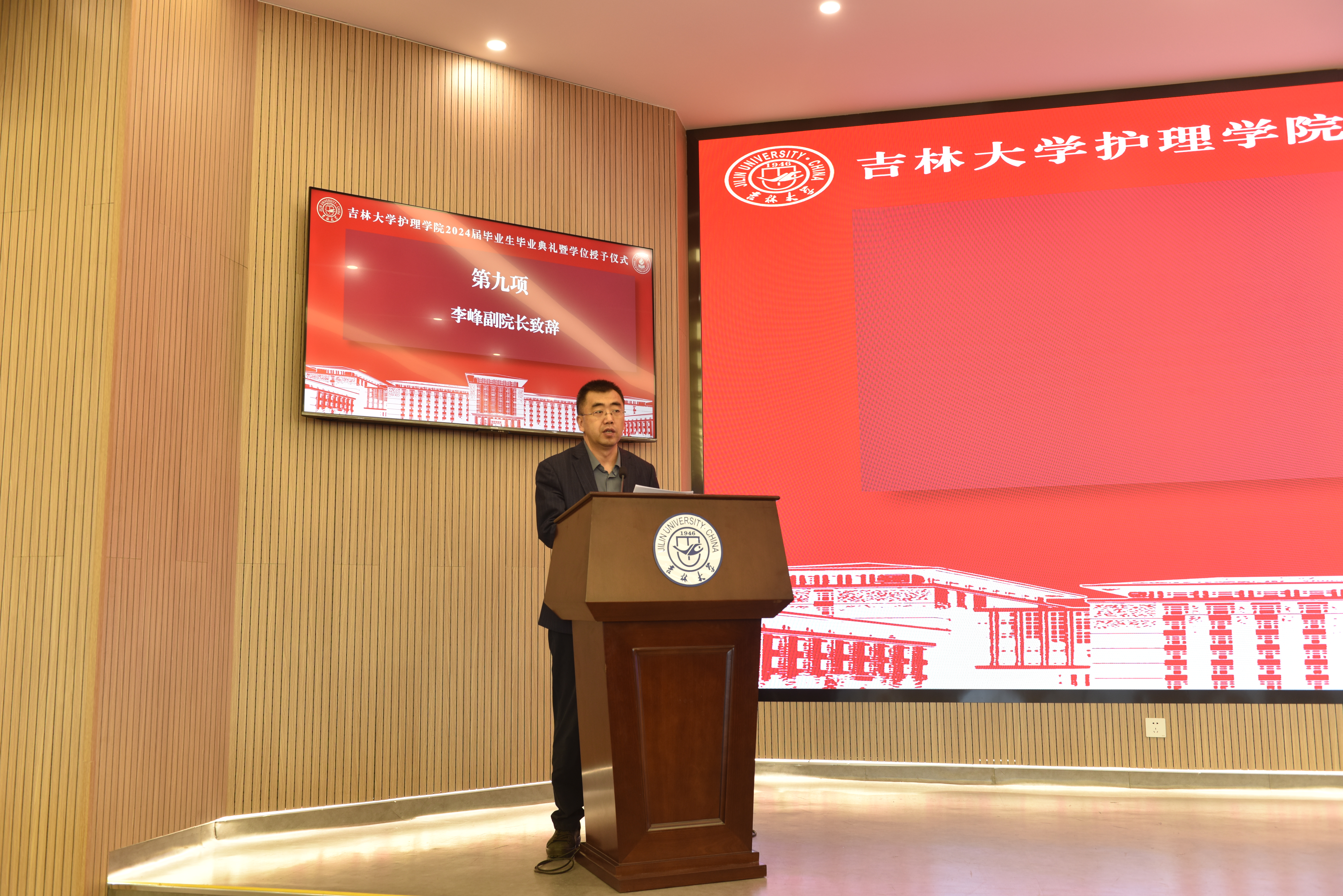 最后,李峰副院长深情致辞,回顾了毕业生在学院的成长历程,共同见证了学院的建设发展,表达了对全体毕业生的殷切希望和真挚祝福:一是希望同学们刻苦钻研、精益求精,让勤奋学习成为青春远航的动力,让增长本领成为青春搏击的能量;二是希望同学们脚踏实地,行稳致远,在摸爬滚打中增长才干,在层层历练中积累经验,积极投身中国式现代化的伟大实践中;三是希望同学们志存高远,担当作为,把个人的前途命运与国家发展、民族振兴、社会进步紧密地融合在一起,不忘初心、牢记使命、不负时代,在新时代、新天地中施展抱负、建功立业,成为伟大理想的追梦人。