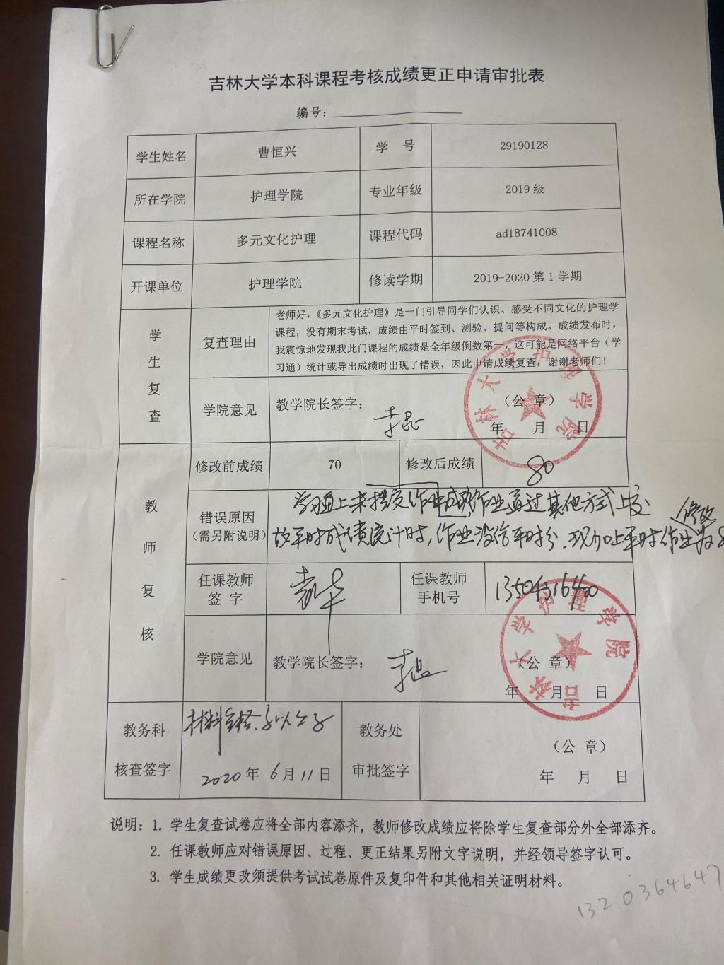 根据《关于进一步明确本科生课程考核等有关问题的通知》(校教字〔2018〕47号)文件有关精神,现对福利姬 2019级曹恒兴同学(学号:29190128)2019-2020-1学期课程成绩更正如下: