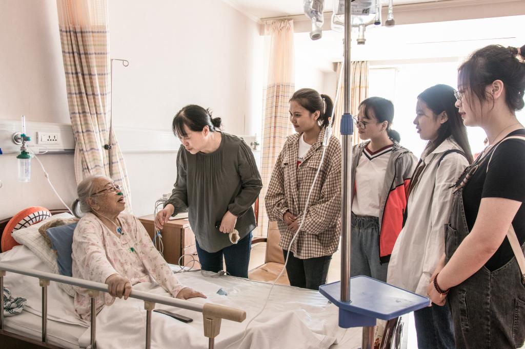 学生第一党支部书记李亚琴老师的带领下,支部成员们一同看望了88岁、因病住院的离休老党员张老师。得知大家来看望自己,正处在康复期的张老师十分激动和喜悦。李亚琴老师与张老师亲切交谈,她握着张老师的手询问了她的身体状况,嘱咐她要保重身体,享受离休的幸福生活。听到这些暖心的话语,张老师流出了感动的泪水。同学们亲切地和张老师交流互动,表达自己对老党员的尊敬与钦佩。