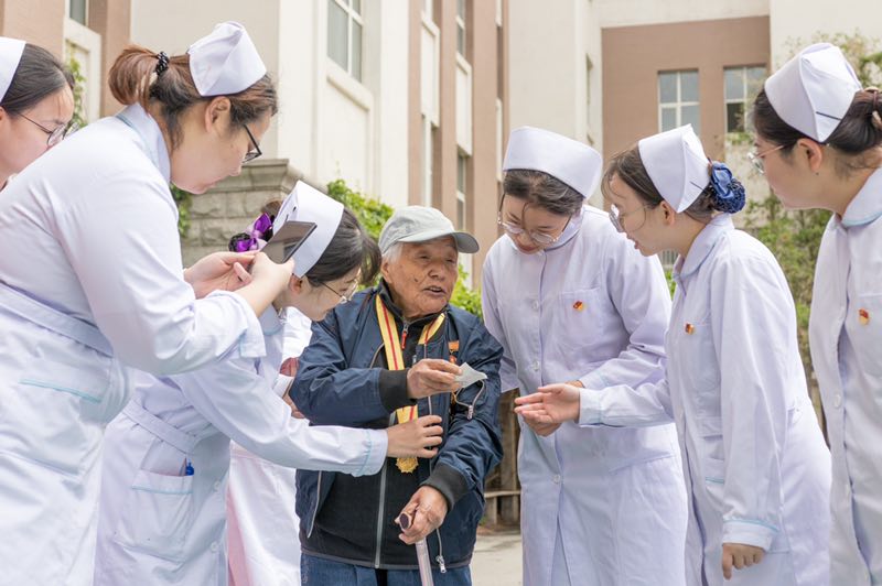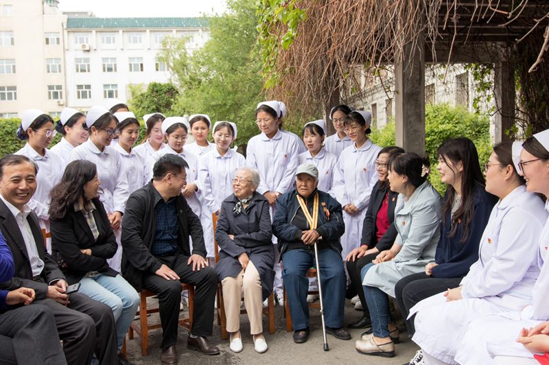 南丁格尔像前举行。我们邀请到了新民校区离休第四党支部的老党员、89岁高龄的牛慧英同志和87岁高龄的张丽华同志来到福利姬